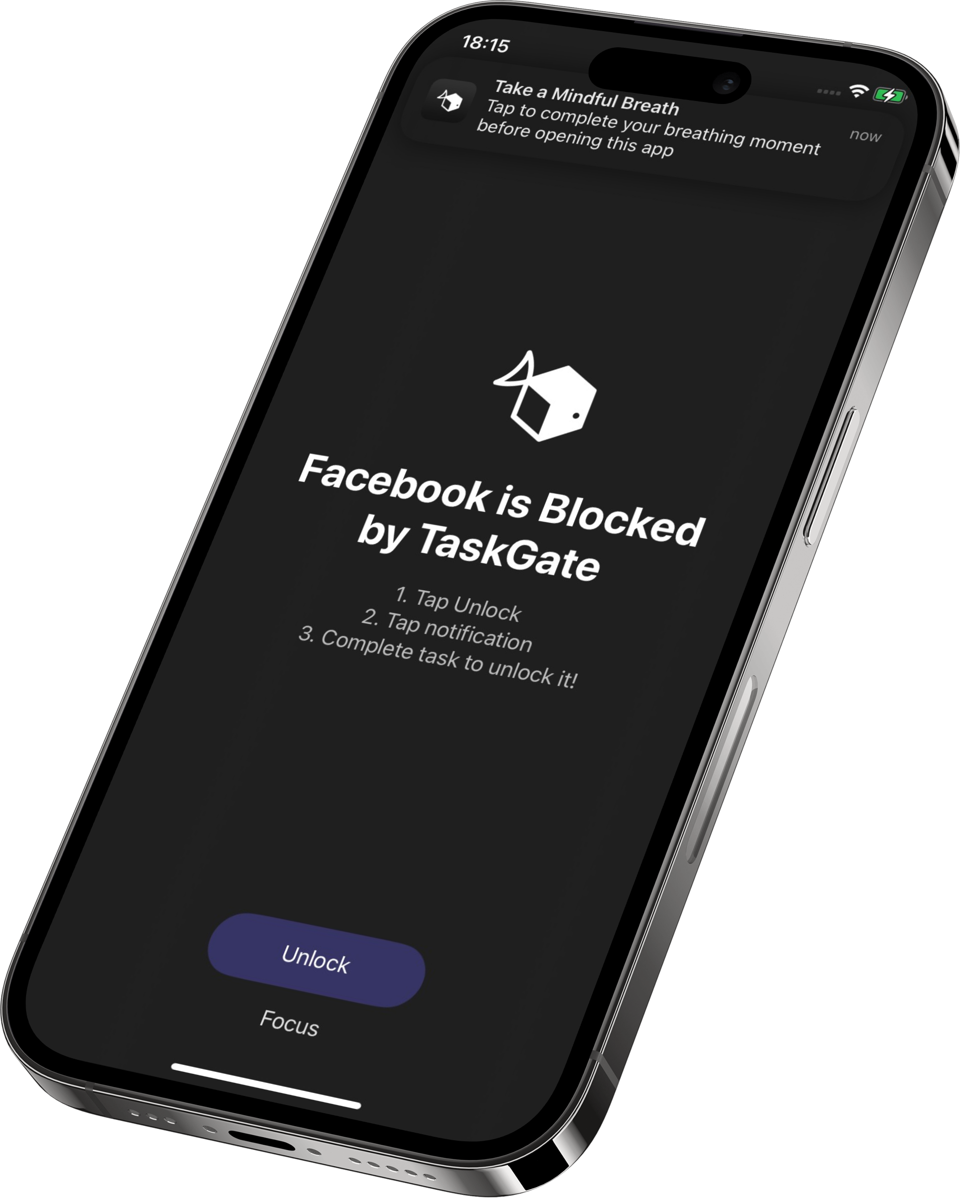 TaskGate intercepts impulsive app opens and requires you to complete a quick task before access is granted. Choose from built-in mini-tasks like breathing exercises, reflections, and flashcards—or connect with partner apps for even more variety.